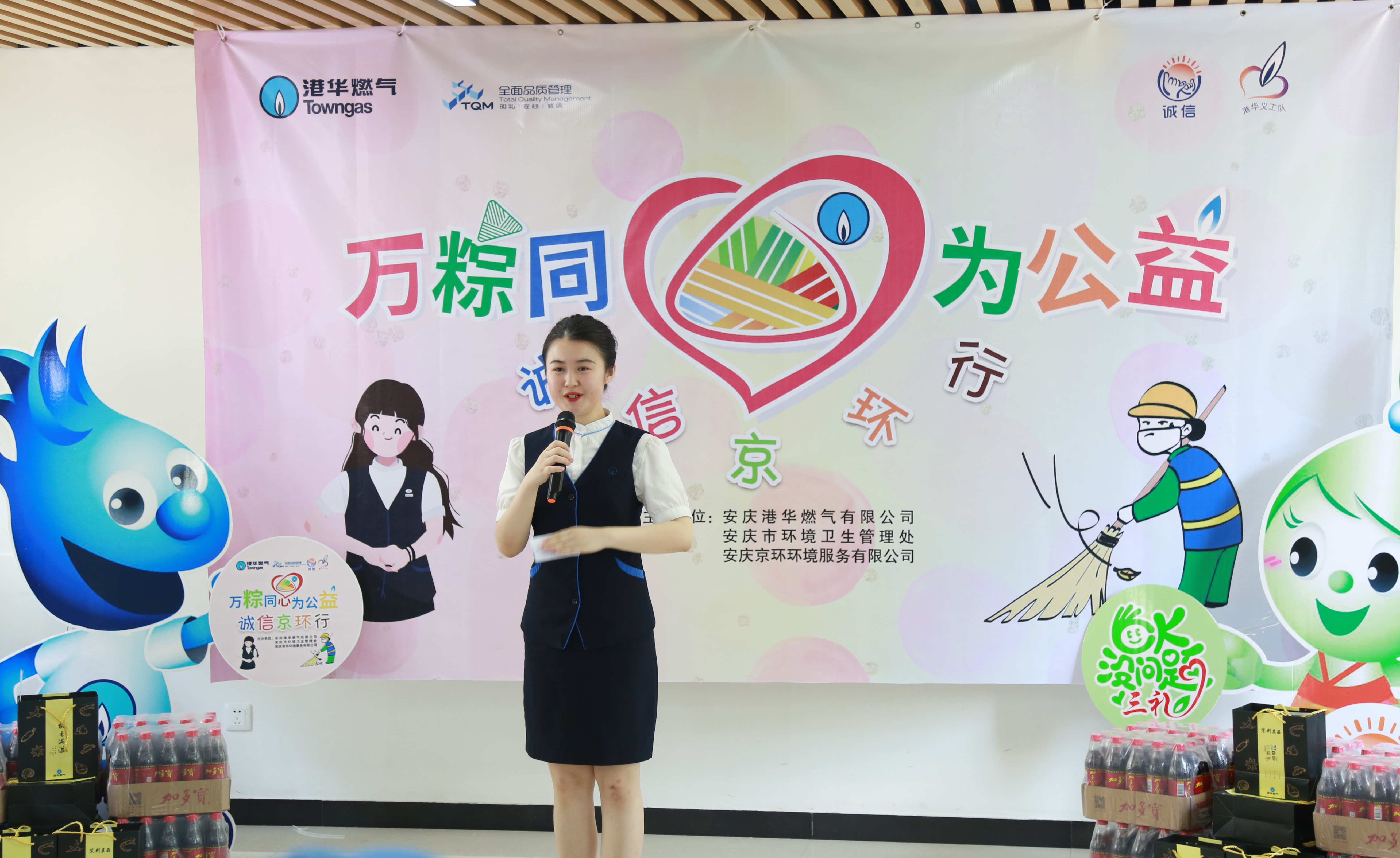 為傳遞社會正能量,帶動更多社群關(guān)注環(huán)保、關(guān)心環(huán)衛(wèi)人員,同時積極推進港華“誠信”文化的社會傳播,6月4日下午,安慶港華走進安慶京環(huán)環(huán)境服務有限公司,舉辦2019年“萬粽同心為公益”暨“誠信京環(huán)行”活動。安慶港華副總經(jīng)理黃蔥蔥、安慶京環(huán)工會副主席高景利分別為活動致辭,安慶港華藍焰義工隊員及京環(huán)環(huán)衛(wèi)工代表共50余人參加活動。