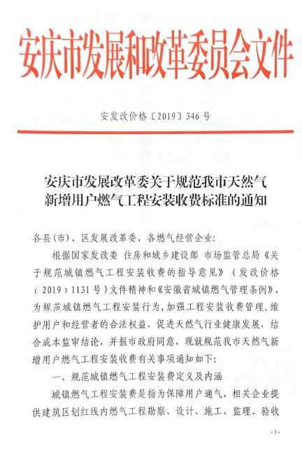 安慶市發(fā)展改革委關于規(guī)范我市天然氣新增用戶燃氣工程安裝收費標準的通知(2019) 發(fā)布時間:2020-02-19    閱讀次數:12362次