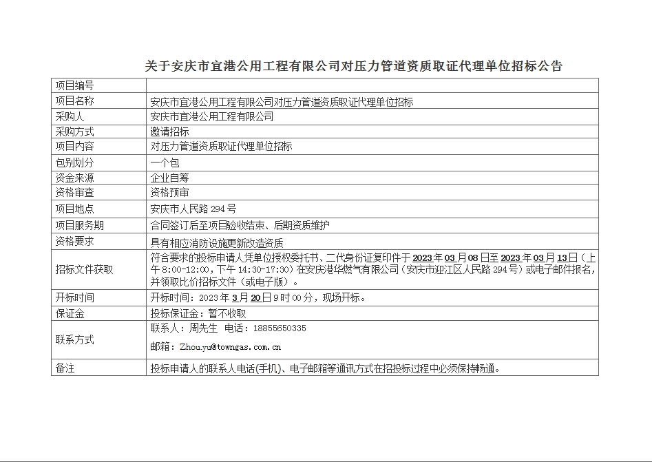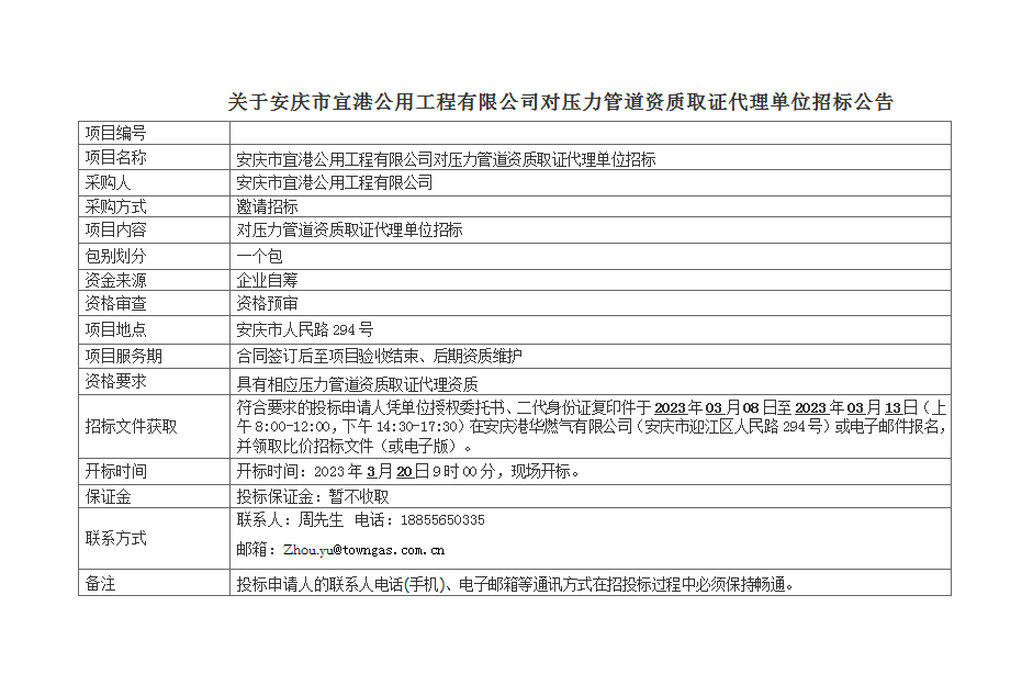 關(guān)于安慶市宜港公用工程有限公司對(duì)壓力管道資質(zhì)取證代理單位招標(biāo)公告