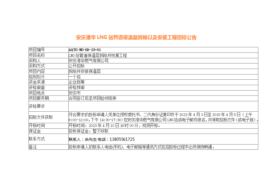 安慶港華LNG站管道保溫層拆除以及安裝工程招標公告