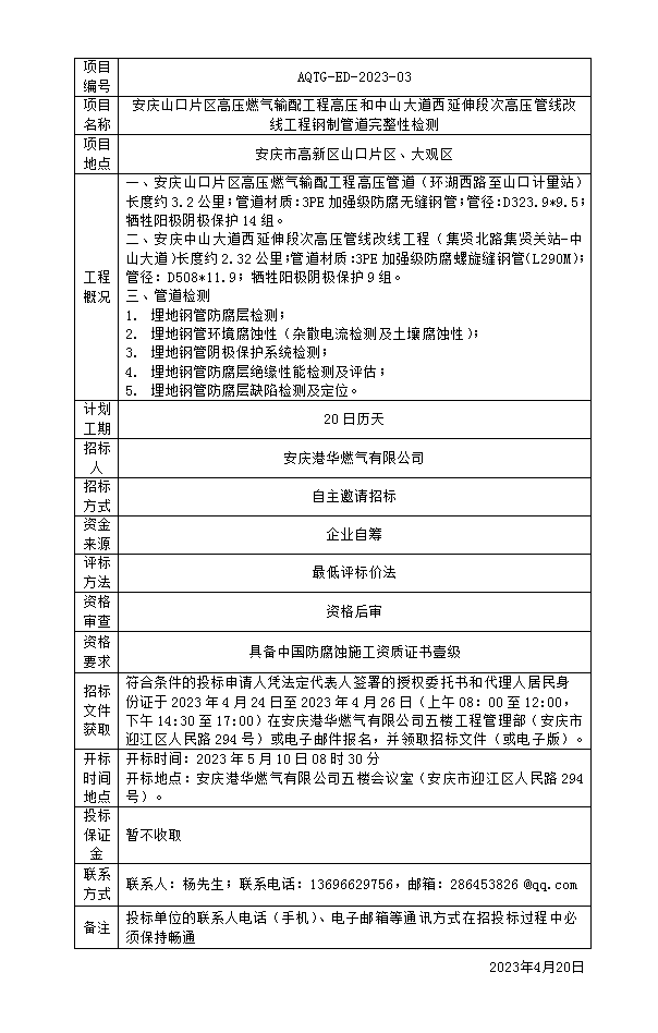 安慶山口片區(qū)高壓燃?xì)廨斉涔こ谈邏汉椭猩酱蟮牢餮由於未胃邏汗芫€改線工程鋼制管道完整性檢測招標(biāo)公告