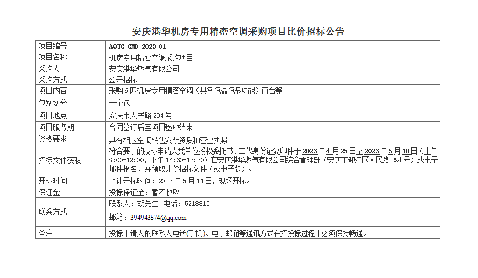 安慶港華機房專用精密空調(diào)采購項目比價招標公告