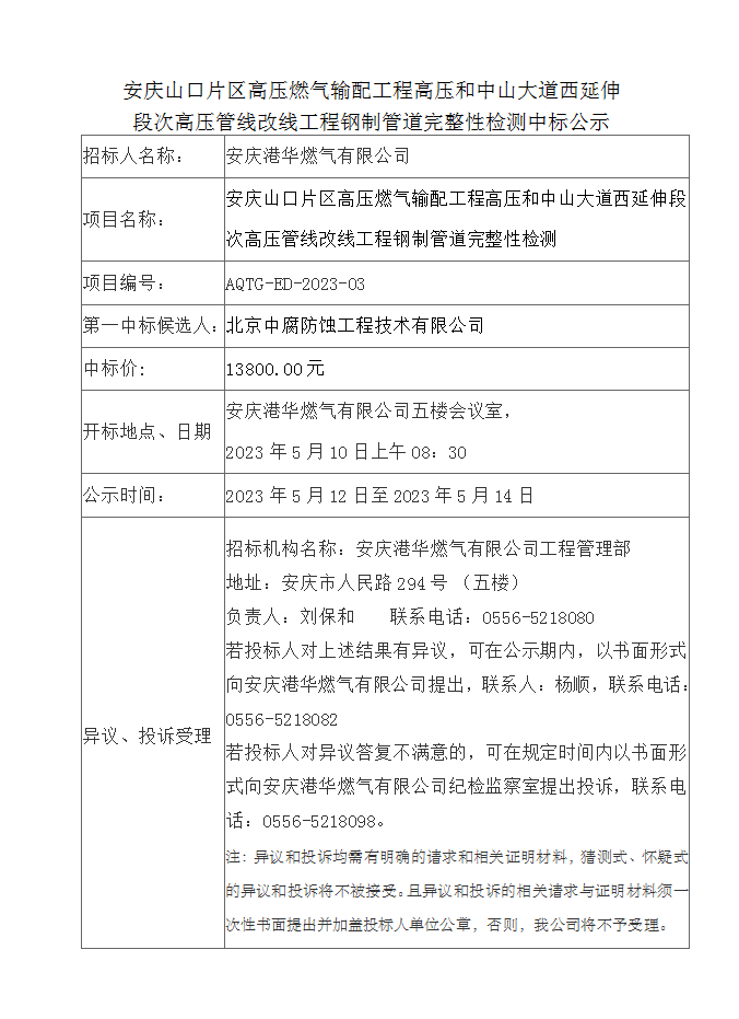 安慶山口片區(qū)高壓燃氣輸配工程高壓和中山大道西延伸段次高壓管線改線工程鋼制管道完整性檢測中標公示