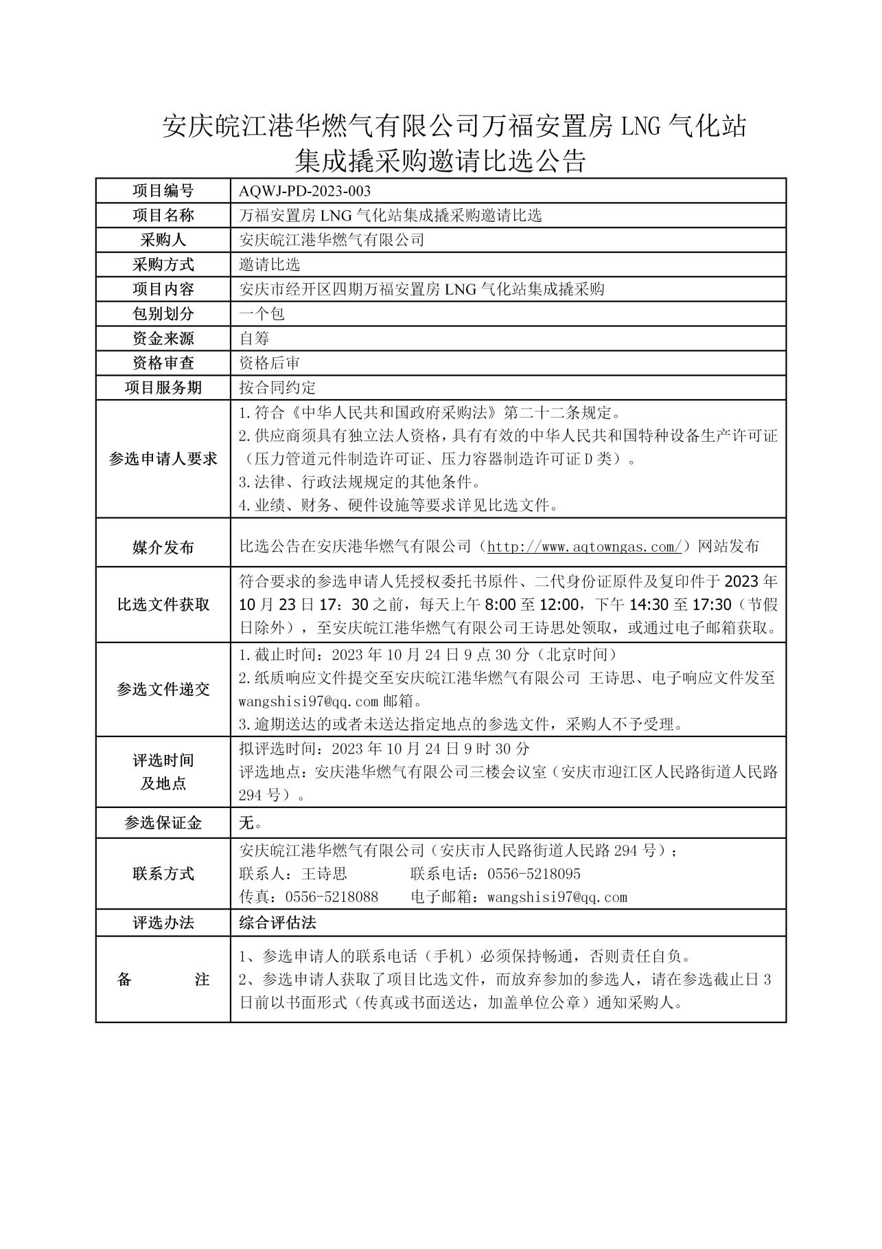安慶皖江港華燃氣有限公司萬福安置房LNG氣化站集成撬采購邀請比選公告