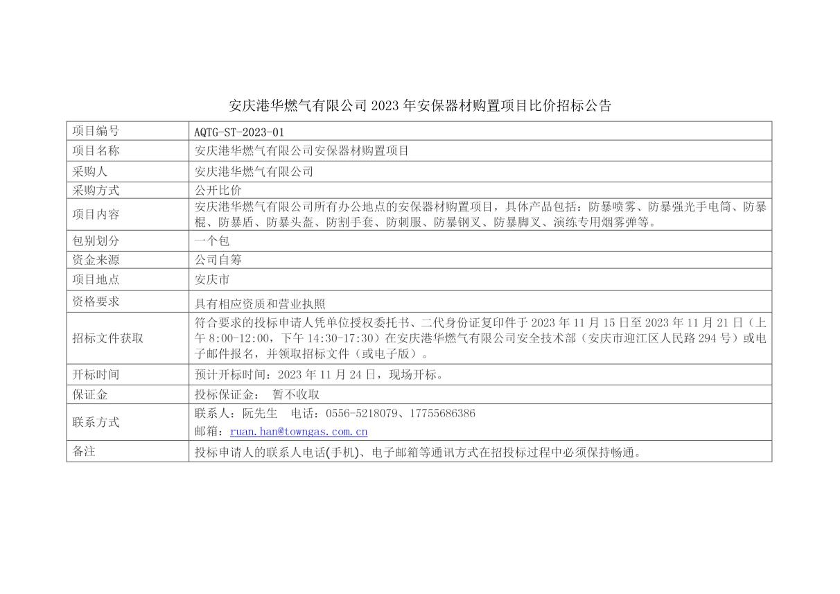 2023安慶港華安保器材購置項目比價招標公告