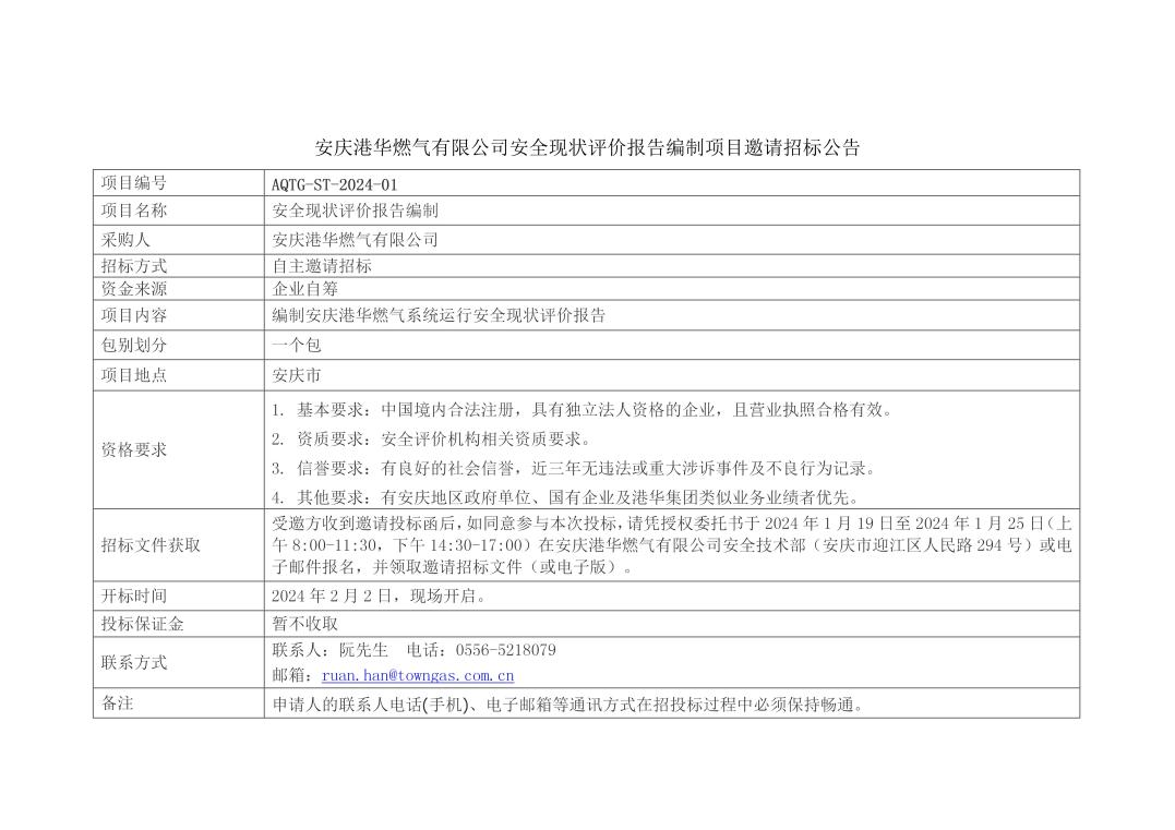 安慶港華安全現(xiàn)狀評價報告編制項(xiàng)目邀請招標(biāo)公告