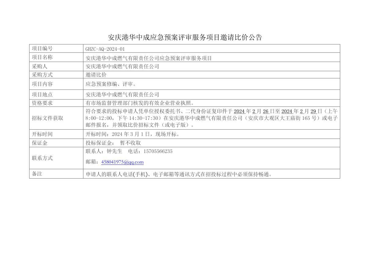 安慶港華中成應(yīng)急預(yù)案評審服務(wù)項(xiàng)目邀請比價公告