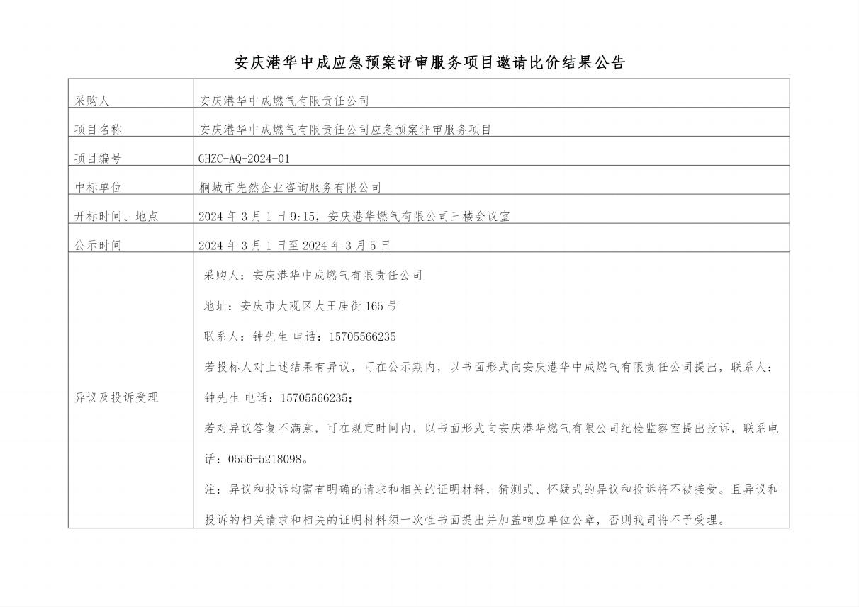 安慶港華中成應(yīng)急預案評審服務(wù)項目邀請比價結(jié)果公告
