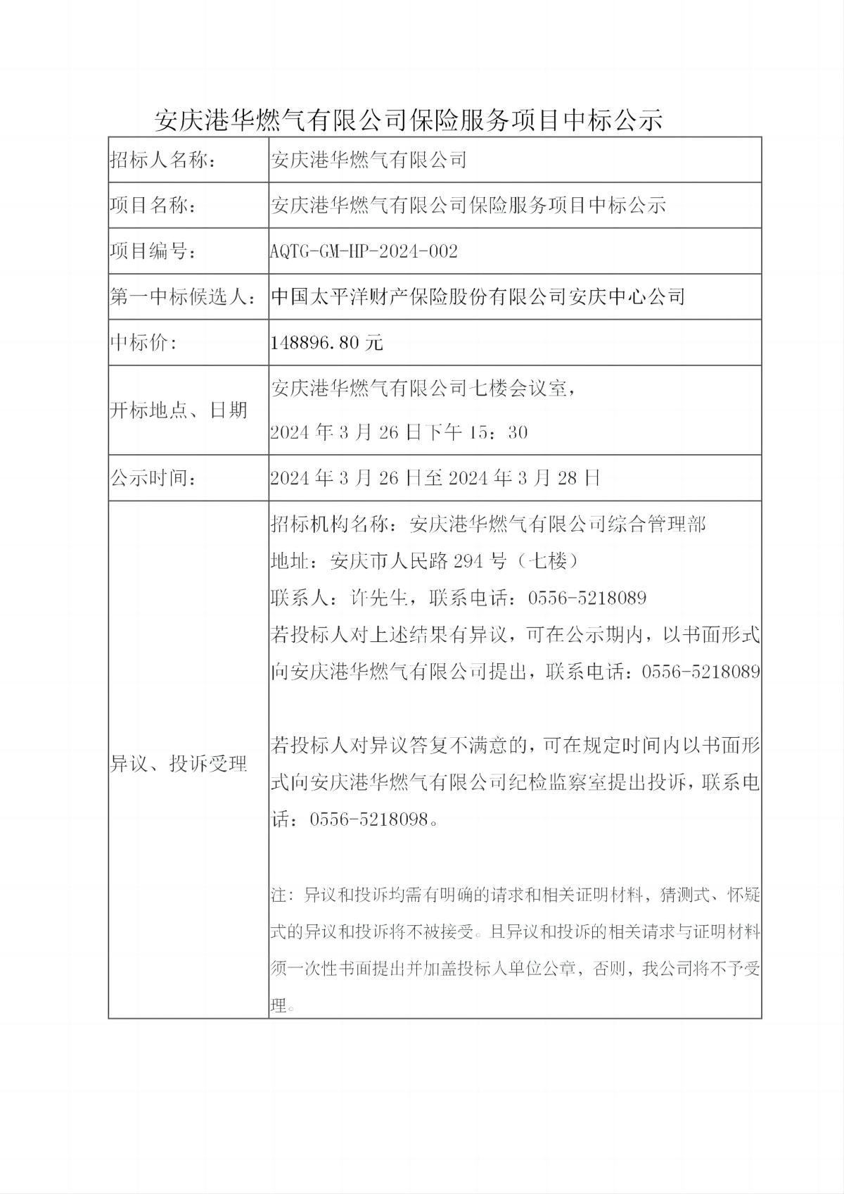 安慶港華燃氣有限公司保險服務(wù)項目中標公示