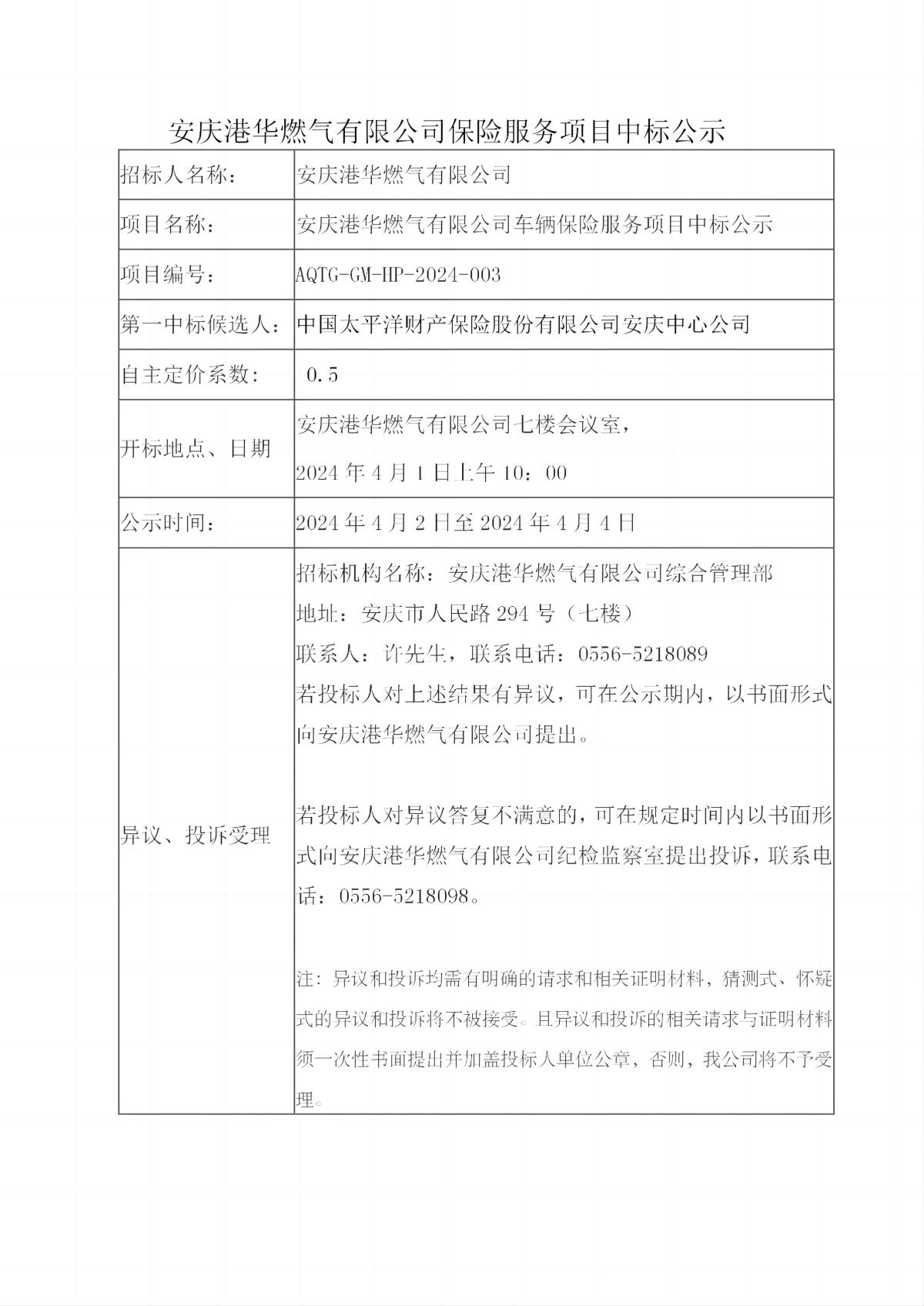 安慶港華燃?xì)庥邢薰颈kU(xiǎn)服務(wù)項(xiàng)目中標(biāo)公示