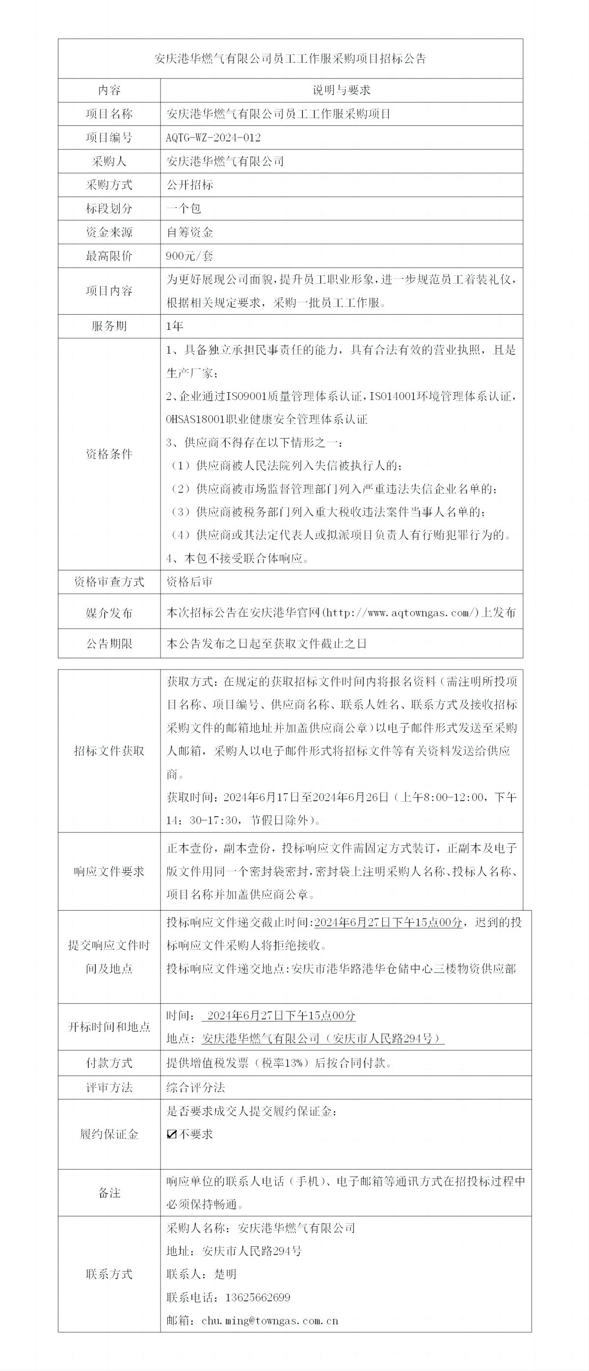 安慶港華燃?xì)庥邢薰締T工工作服采購(gòu)項(xiàng)目招標(biāo)公告