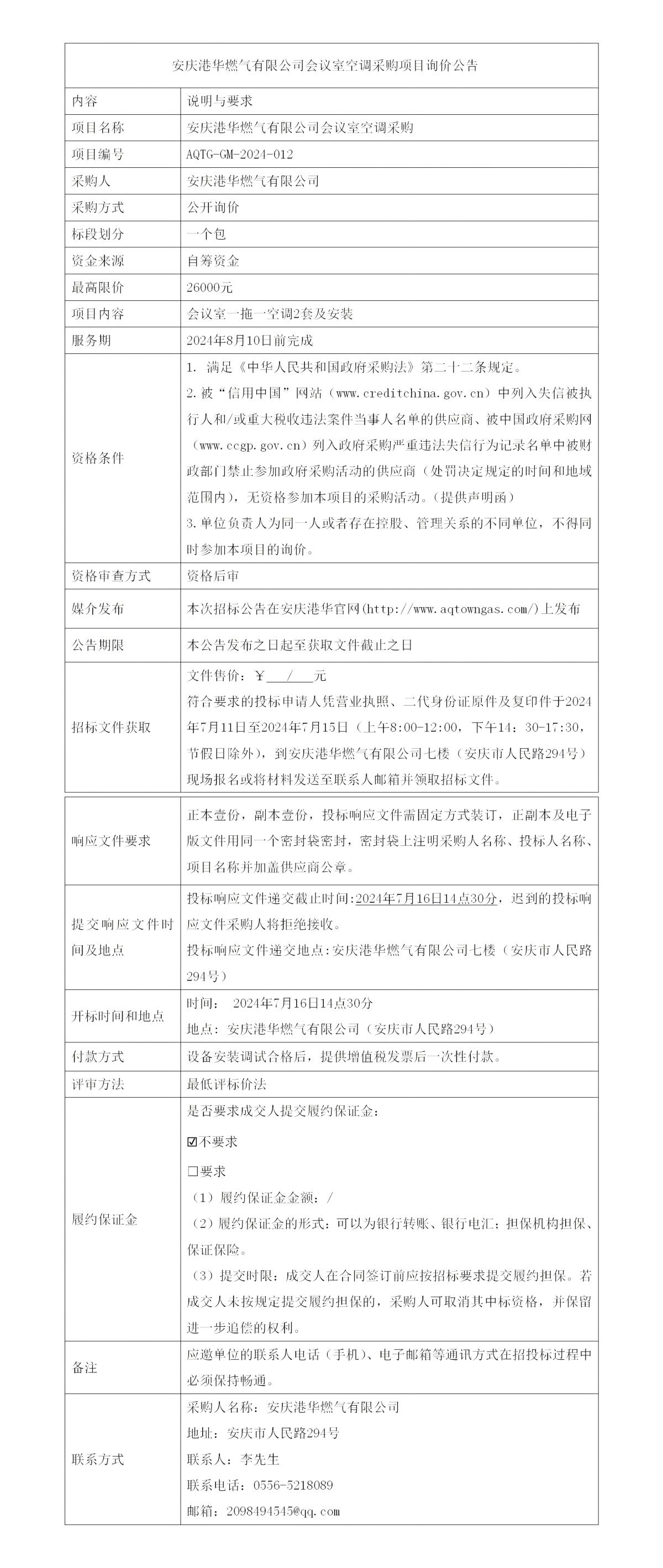 安慶港華燃?xì)庥邢薰緯?huì)議室空調(diào)采購(gòu)項(xiàng)目詢(xún)價(jià)公告