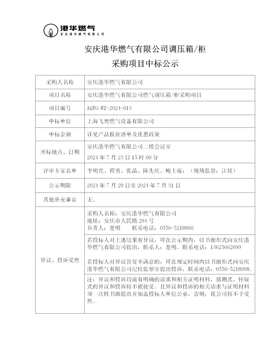 安慶港華燃氣有限公司調(diào)壓箱/柜采購項目中標公示
