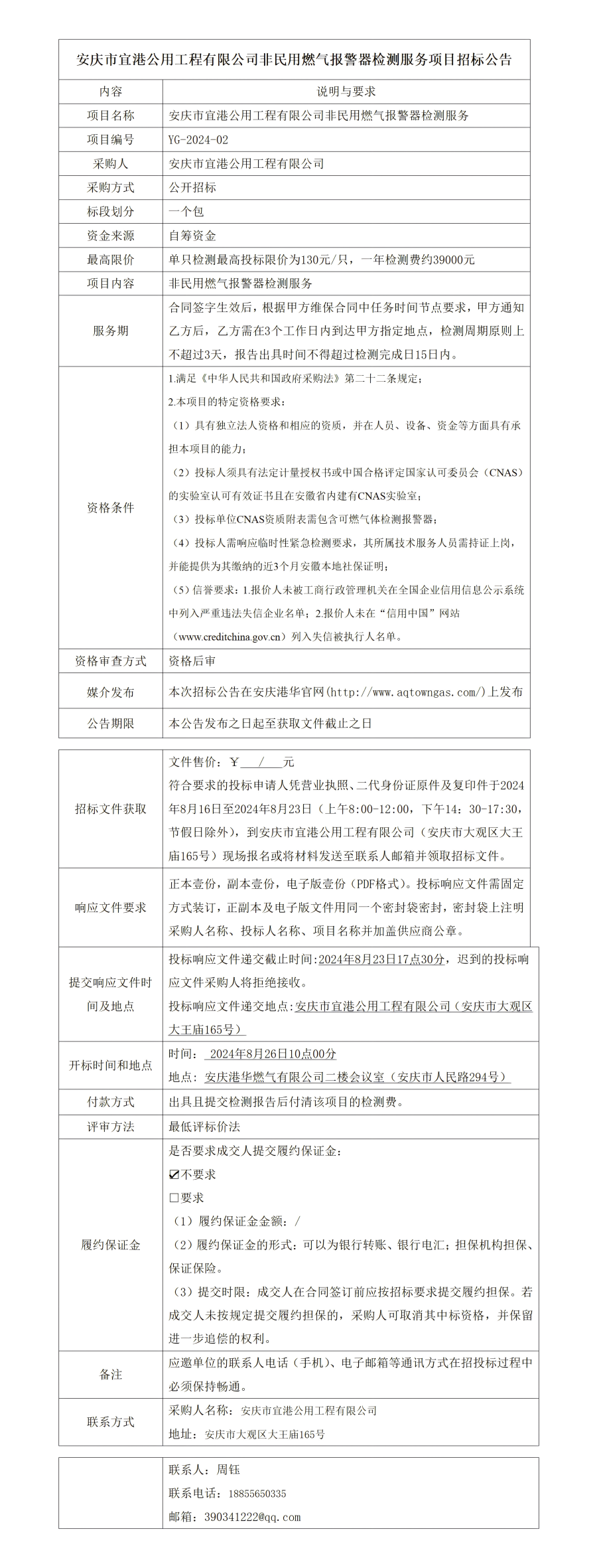 安慶市宜港公用工程有限公司非民用燃氣報警器檢測服務項目招標公告