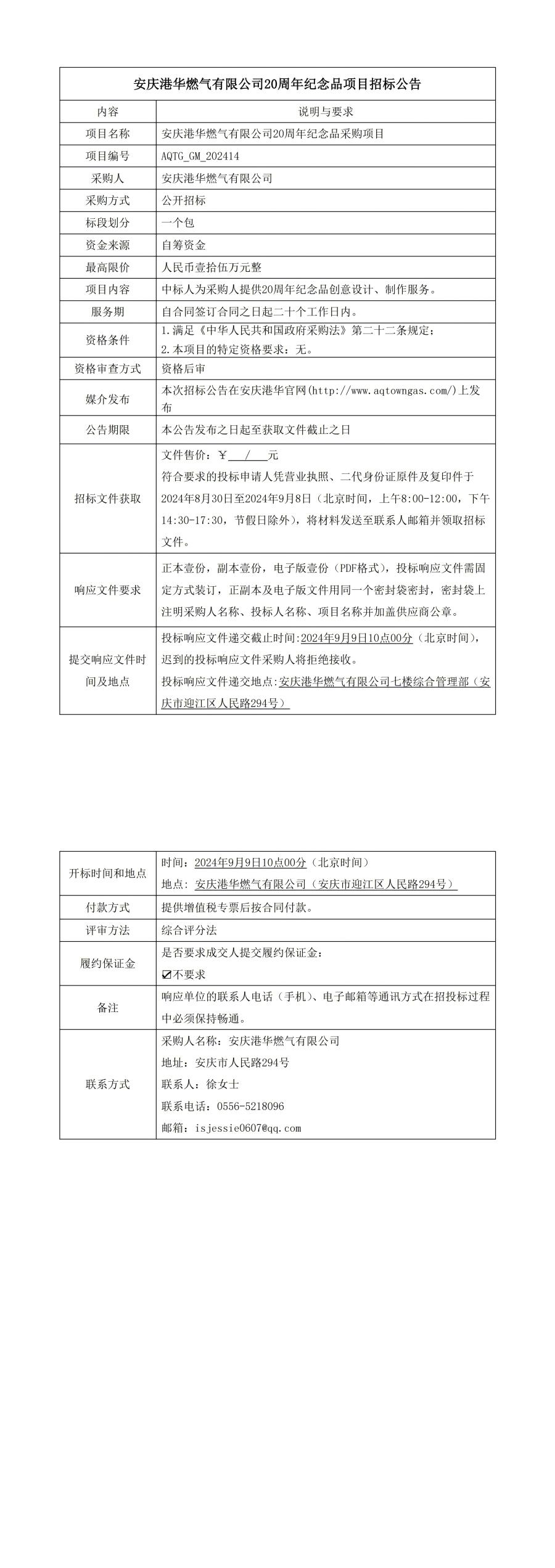 安慶港華燃氣有限公司20周年紀念品項目招標公告