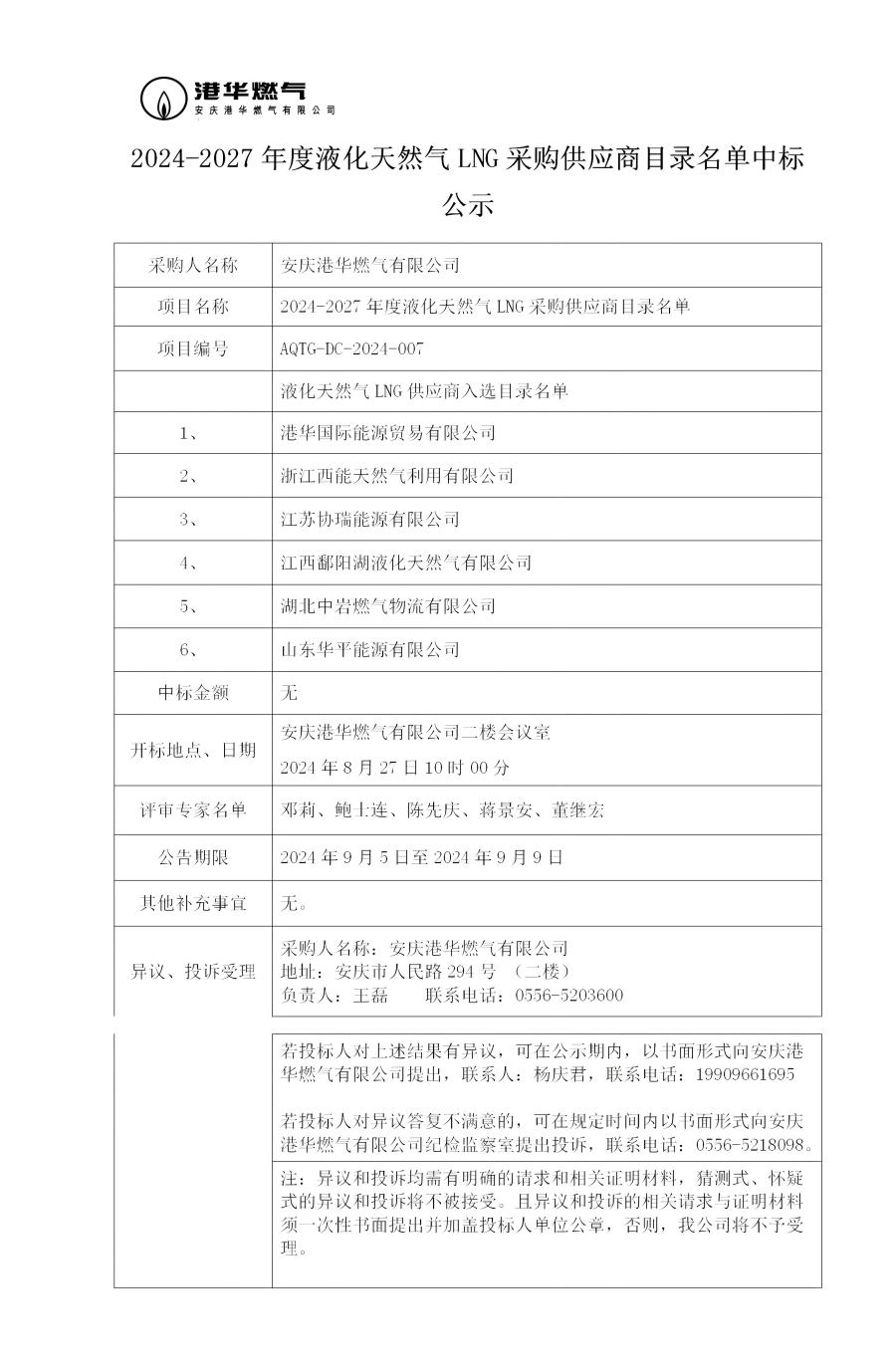 2024-2027年度液化天然氣LNG采購供應(yīng)商目錄名單中標公示