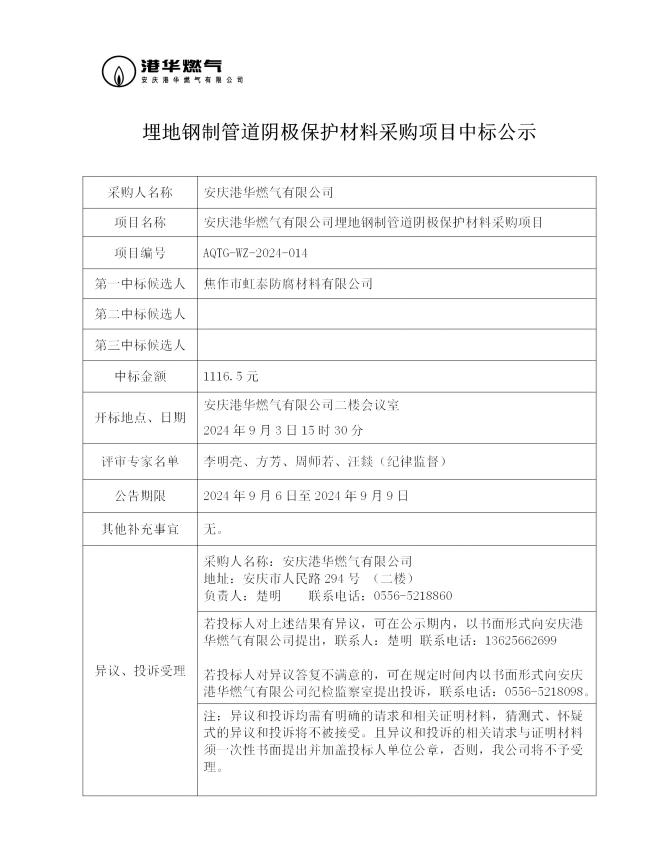 安慶港華燃?xì)庥邢薰韭竦劁撝乒艿狸帢O保護(hù)材料采購(gòu)項(xiàng)目中標(biāo)公示