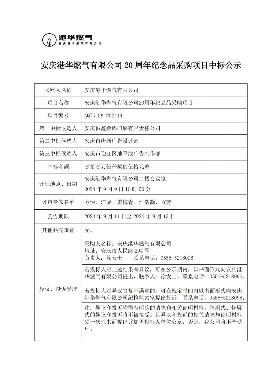 安慶港華燃氣有限公司 20 周年紀念品采購項目中標公示