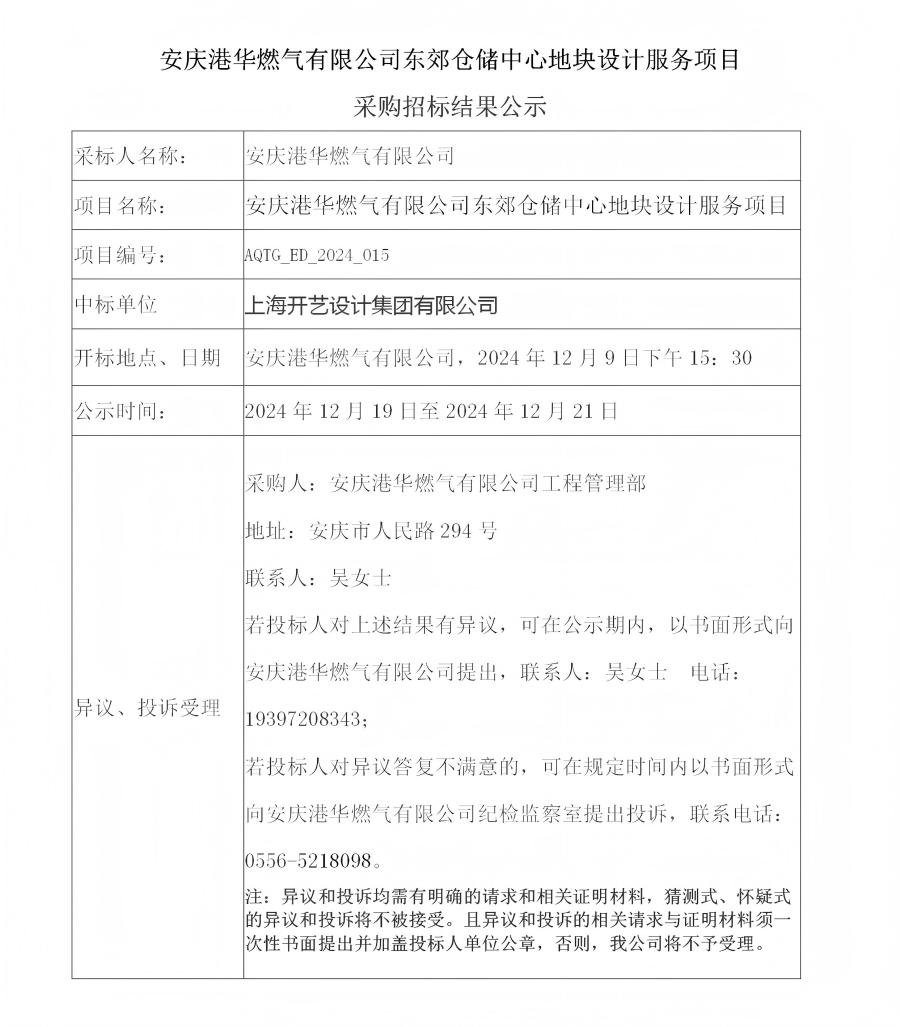 安慶港華燃?xì)庥邢薰緰|郊倉儲中心地塊設(shè)計服務(wù)項目采購招標(biāo)結(jié)果公示
