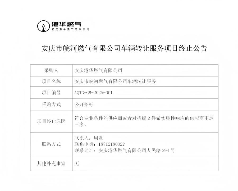 安慶市皖河燃?xì)庥邢薰拒囕v轉(zhuǎn)讓服務(wù)項目終止公告
