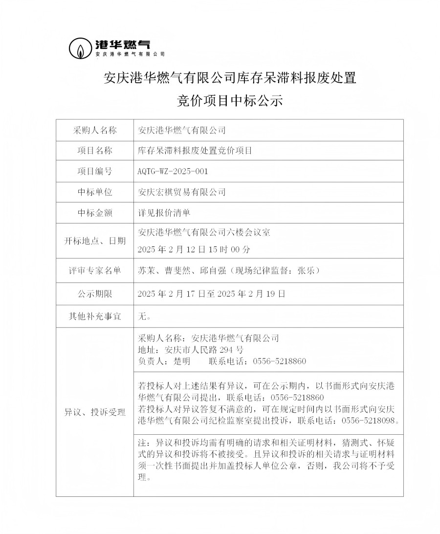 安慶港華燃?xì)庥邢薰編齑娲魷蠄髲U處置競價項目中標(biāo)公示