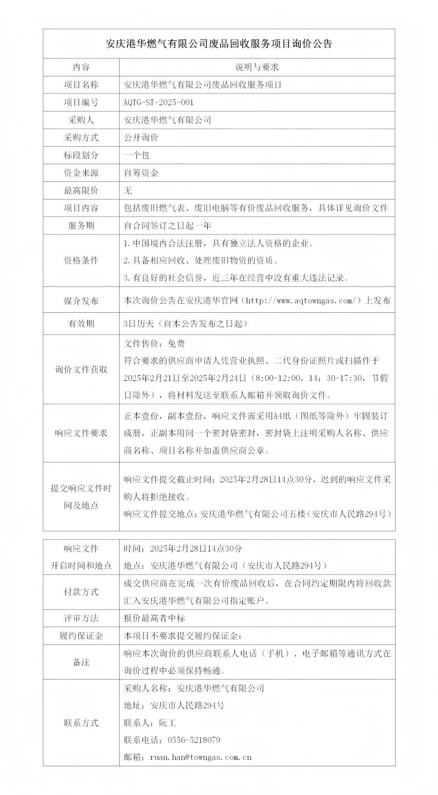 安慶港華燃?xì)庥邢薰緩U品回收服務(wù)項(xiàng)目詢價(jià)公告