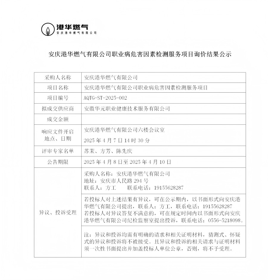 安慶港華燃氣有限公司職業(yè)病危害因素檢測服務項目詢價結果公示