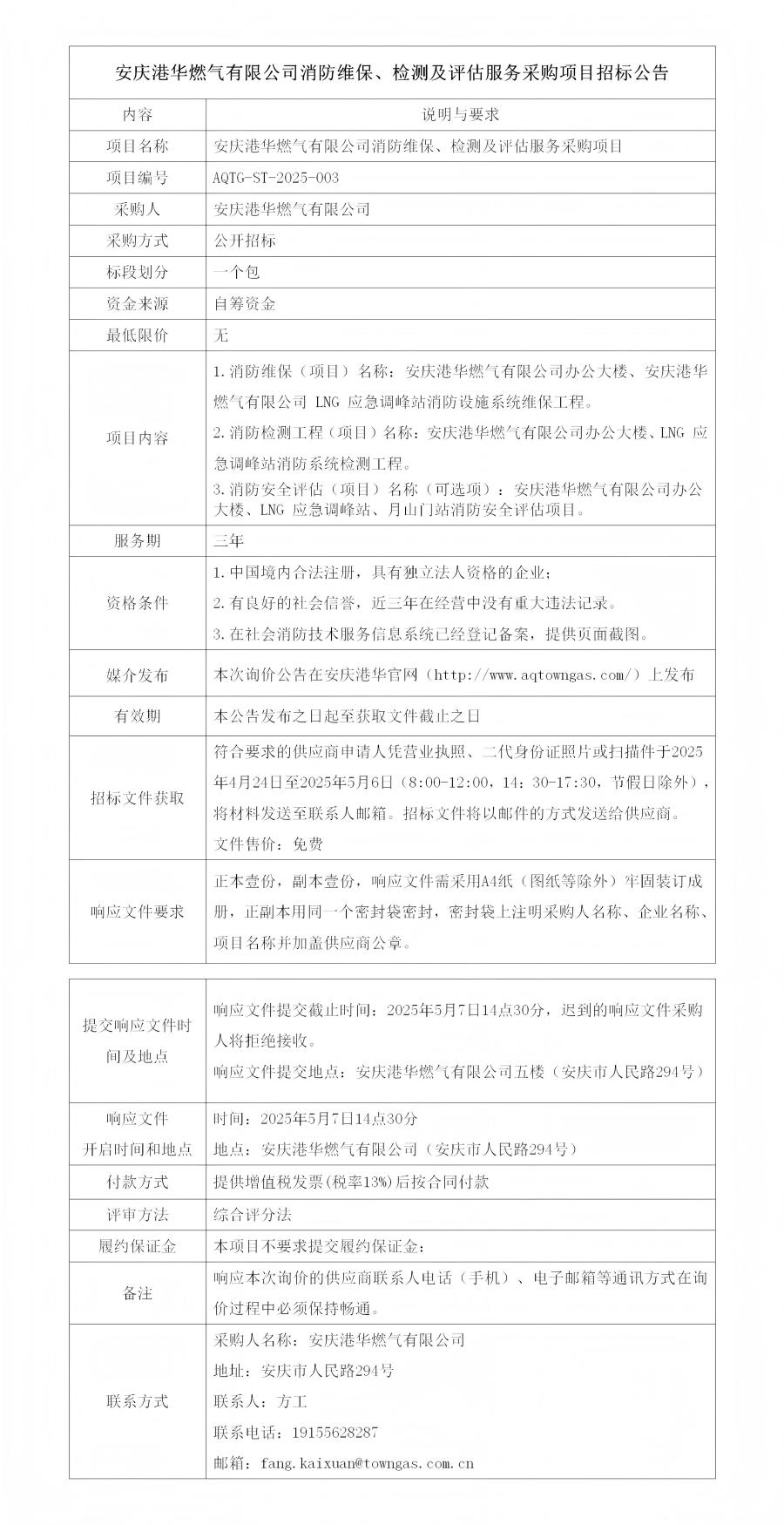 安慶港華燃氣有限公司消防維保、檢測及評估服務采購項目招標公告