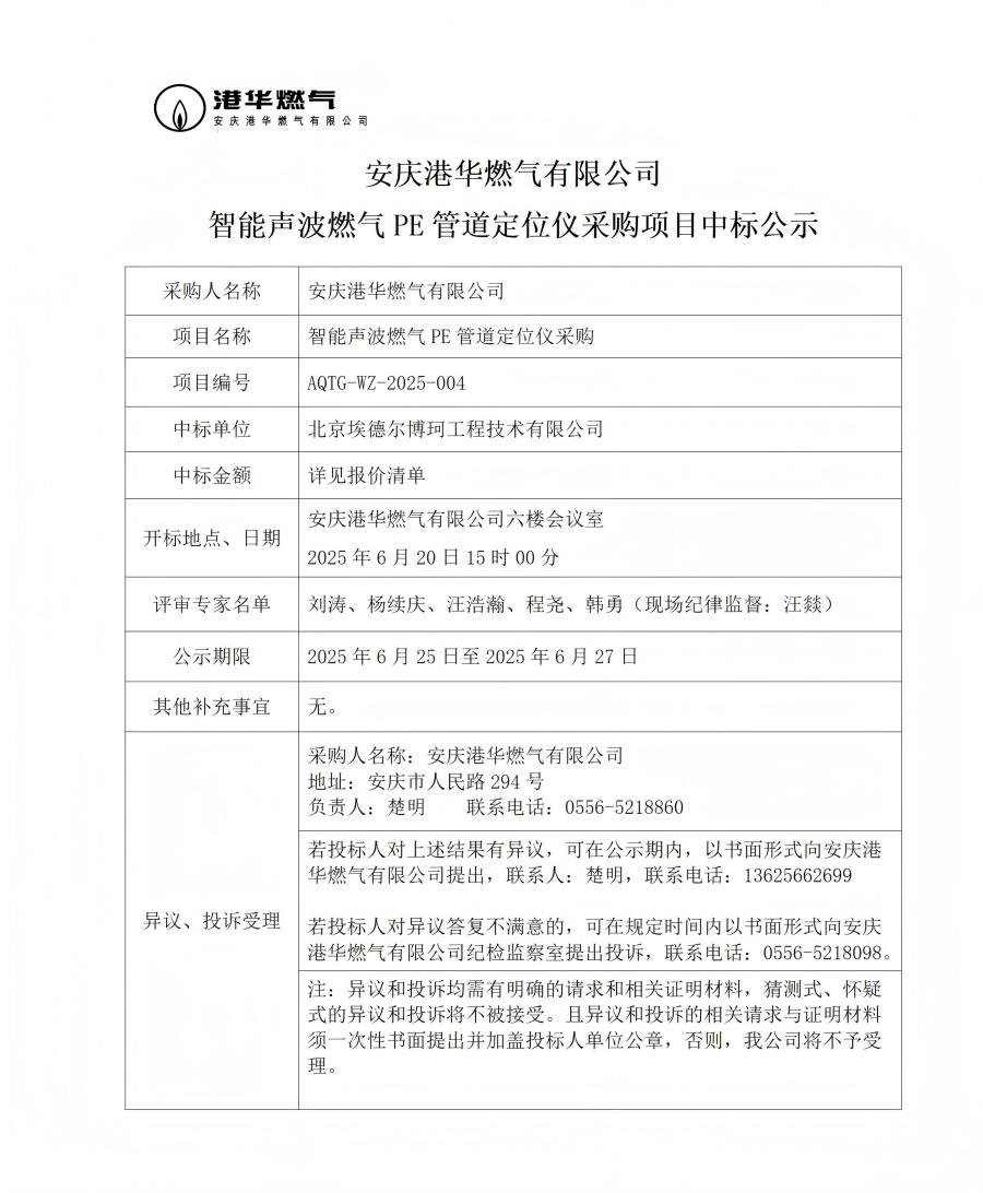 安慶港華燃氣有限公司智能聲波燃氣PE管道定位儀采購項目中標公示