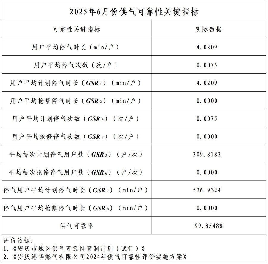 2025年6月份供氣可靠性關鍵指標