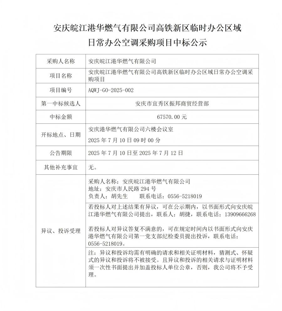 安慶皖江港華燃?xì)庥邢薰靖哞F新區(qū)臨時辦公區(qū)域 日常辦公空調(diào)采購項目中標(biāo)公示