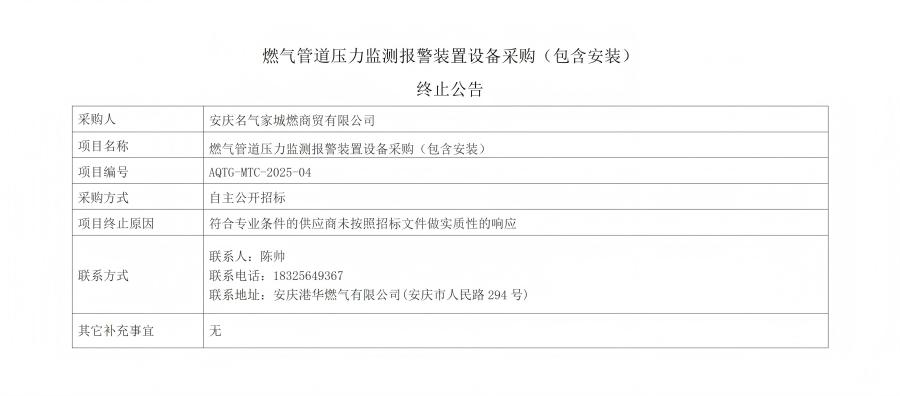 燃?xì)夤艿缐毫ΡO(jiān)測報(bào)警裝置設(shè)備采購(包含安裝)終止公告