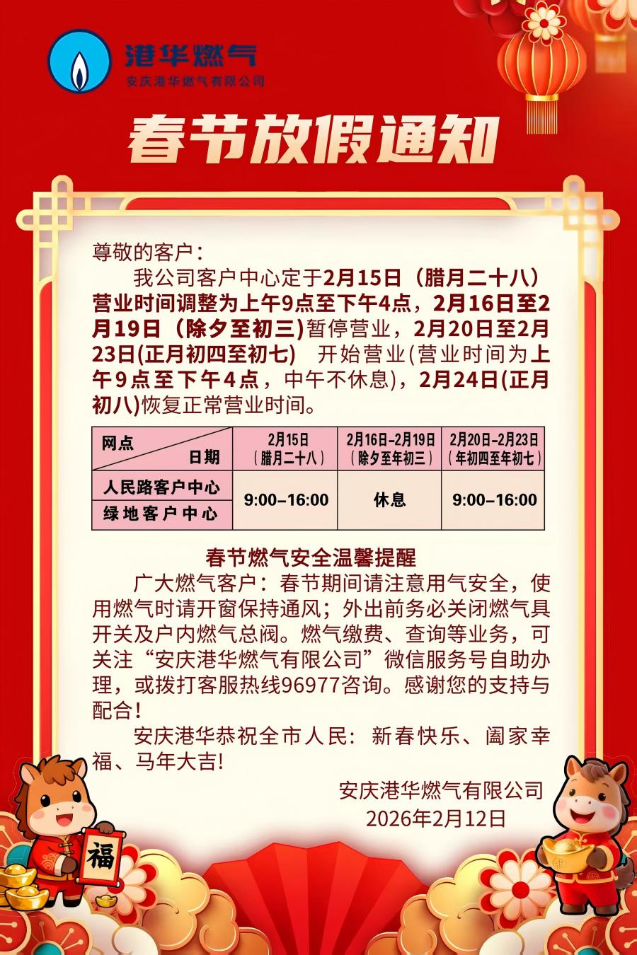 安慶港華燃?xì)饪蛻?hù)中心春節(jié)放假通知